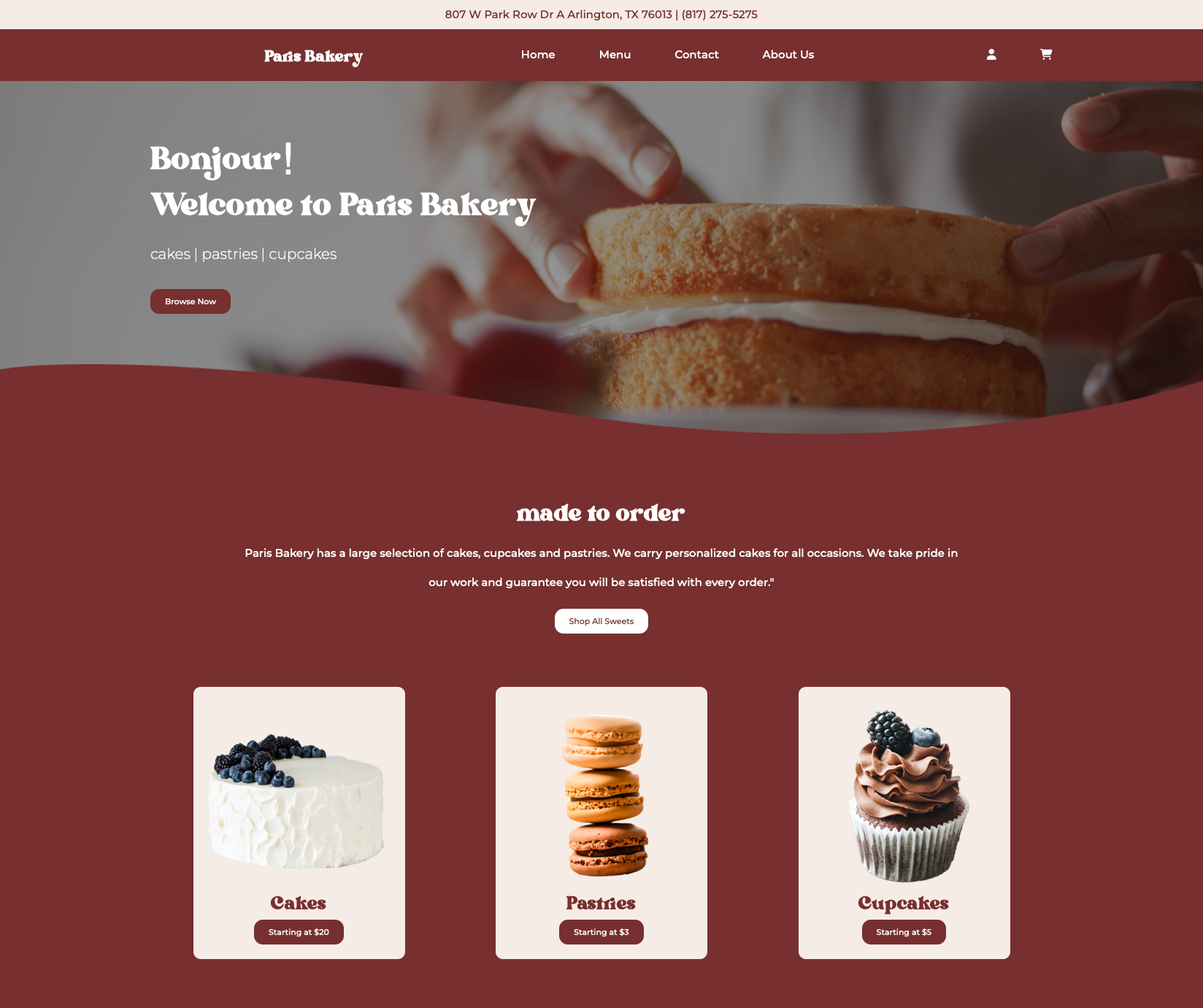 Paris Bakery’s current website is static and very text heavy. The business specializes in selling premium customized cakes for events such as birthdays, weddings, etc. In addition to this they serve fresh pastries and treats daily. These are the points we wanted to incorporate into the website: